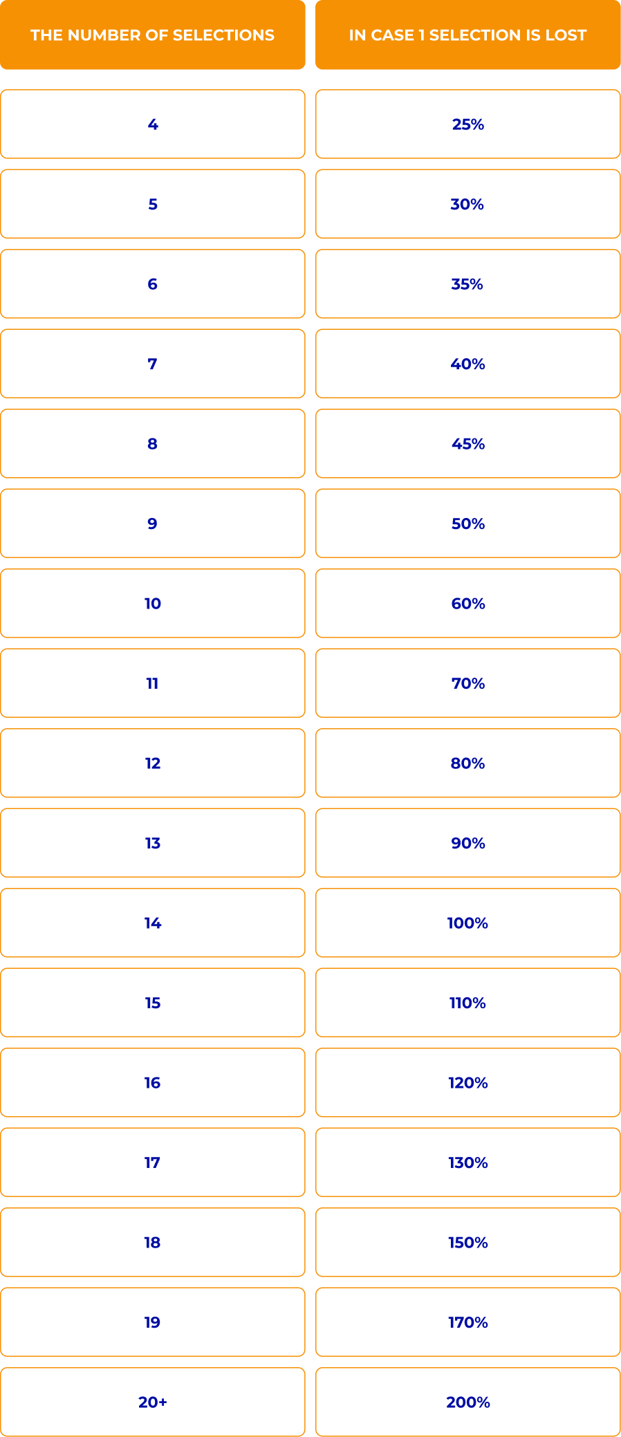 Get up to 200% of your stake amount as a free bet if your multiple bet loses by 1 selection.
